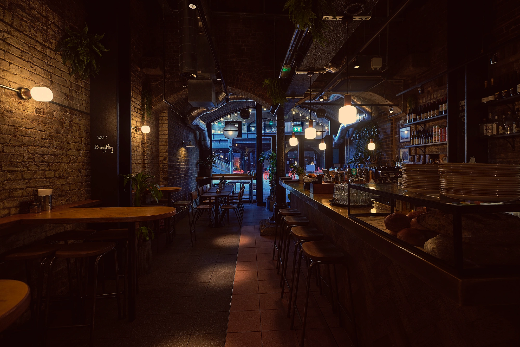 Guests enter through a mysterious, barely branded doorway, stepping onto a bespoke mosaic tiled floor, then through a velvet curtain into the dark, luxurious lounge. The showpiece is a dramatic horseshoe-shaped cocktail bar beneath a refracted light installation we designed, paired with antique mirrors, mesh and glowing apothecary glassware.We collaborated with lighting designers Nulty, developing a layered scheme with light washes across furniture, velvet banquettes and velvet-lined walls, adding to the venue’s theatricality.